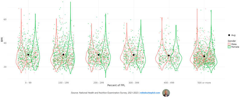 It is clear there is little difference in the distribution and average BMI score by FPL category. The exception is for households with incomes 500 percent or more of the FPL. In that group, we see the average drops slightly and there are fewer individuals with extreme values of BMI and more with BMIs below 30 (see how the violin plot is wider around a BMI of 25, indicating a higher density of values there).